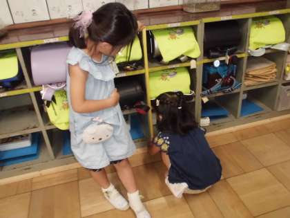 「はしっこをちゃんと合わせてー。」「まっすぐしてー。」と声を掛け合いながら、上手にくらべっこしていました。