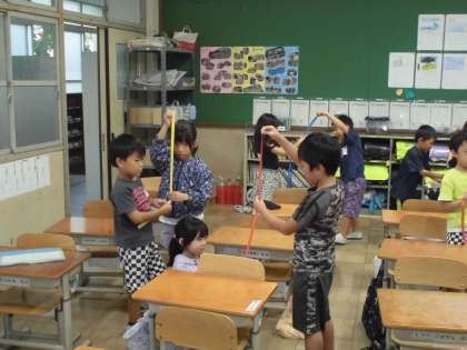 今日は、実際に横に並べて比べられない物の長さを、テープを使って比べました。