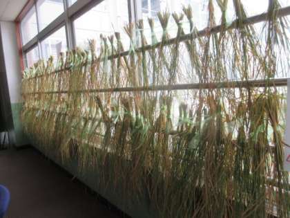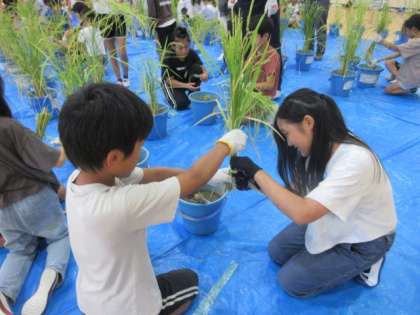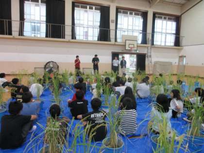 大事に育ててきたバケツ稲の収穫をしました。鎌で切って、束ねて干して・・・。初めて鎌を使った人も多かったのですが、協力して手際よく進めることができました。