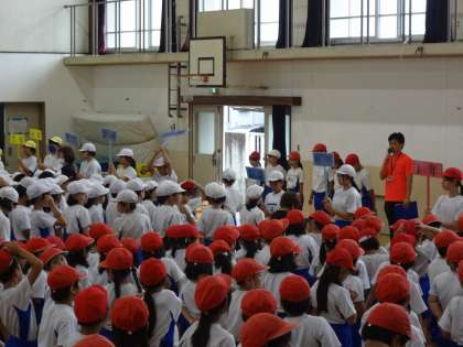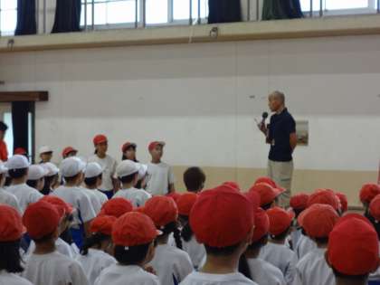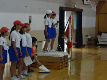あいにくの雨模様のため、体育館に全校児童が集まりました。