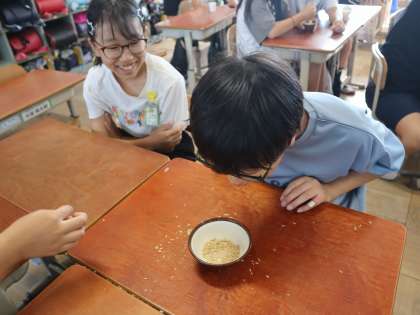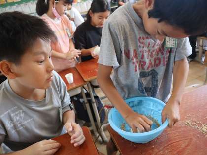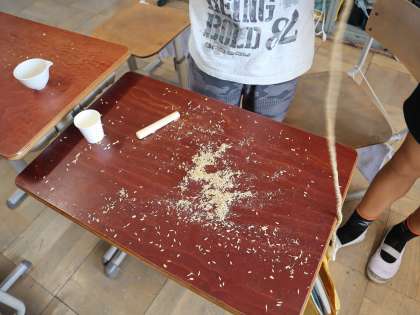 作業が終わったあとの机は、もみの殻でいっぱい。