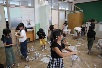 2年生、図工科「新聞紙となかよし」の学習で、新聞を自由に使って遊ぶ学習をしました。