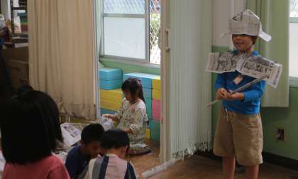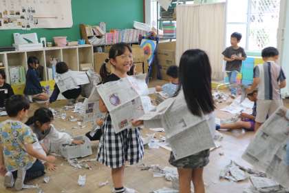 今回は、新聞紙だけでしたが、子ども達が「紐がほしい」「テープがあれば・・・」という声があったので、次回それを用意し、もっと活動の幅を広げていきたいと思います。
