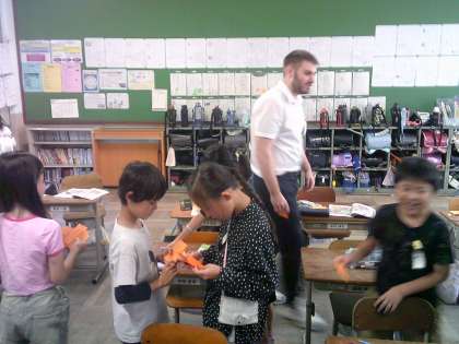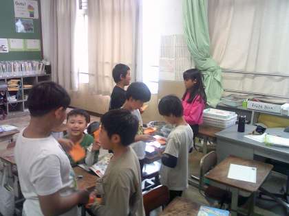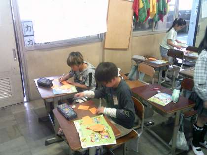 自分のイニシャルをカードにしました。そして、英語であいさつをしてカードを交換しました。