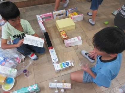 家から持ってきた空き箱や牛乳パックなどを使って、どんな遊びができるのか、試しながら探っています。