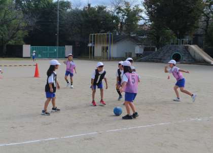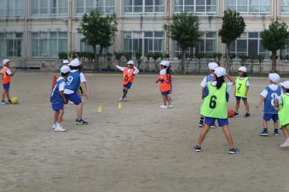 今日体育の「ボールけりゲーム」の学習で試合を行いました。