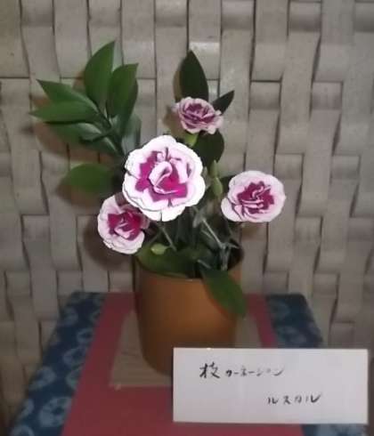 学校の玄関先に飾られた枝カーネーションが