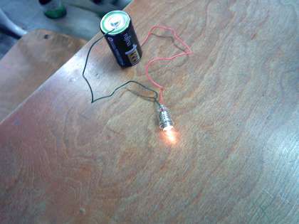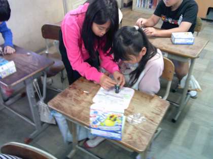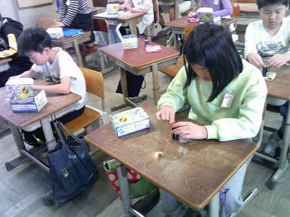 乾電池の向きやつなぎ方などを変えて実験をしていました。