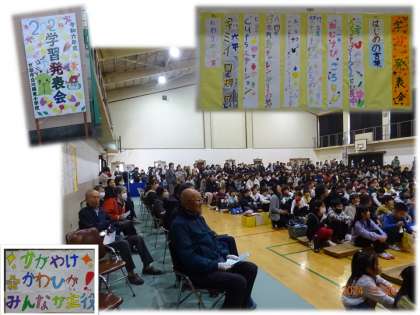 昨年度より取組を大きく変更し、全校参集して、各学年が学習したことを、学年の特質を生かして表現するという方法をとっています。今年度は、昨年度の反省を踏まえ、午前中にすべての発表が終わるように工夫をしました。どの学年も日ごろの学習の様子を工夫して発表していました。