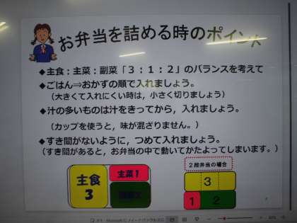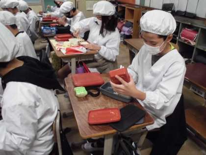自分が普段使っているお弁当箱に、ごはんやおかずを詰め替えて、中学生に必要な食事の量を確かめました。