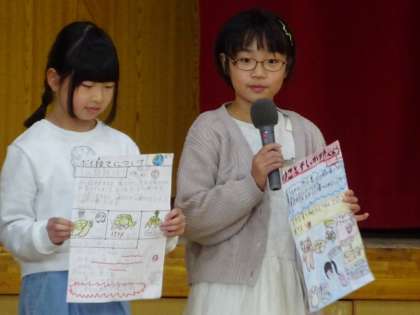 給食の残菜を減らしたり、電気や水の無駄遣いを見直していきましょうとのことでした。ポスターも作ってくれていました。学校や家庭、地域で一人一人が意識して取り組んでいきましょう。