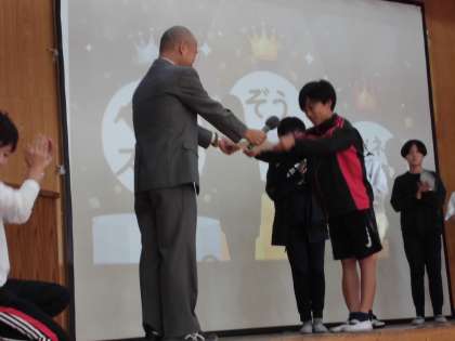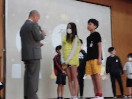なかよしグループで行ったかわひがラリーの表彰しきで、6年生が代表として賞状をいただきました。