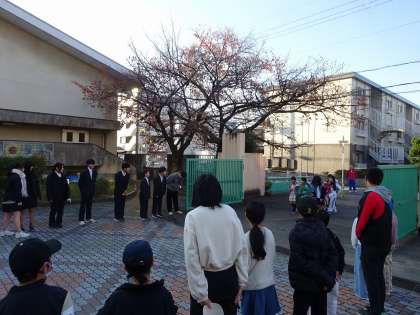 桂川中学校からは、中学生が来て、小学校の児童と一緒に正門であいさつを行っています。はじめは緊張した様子でしたが、だんだん緊張もほぐれて、気持ちのよいあいさつの声が聞こえてきました。