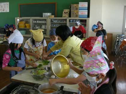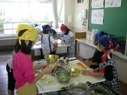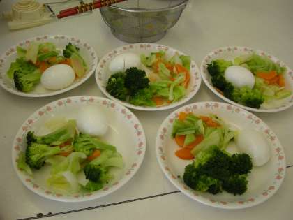 家庭科の学習で調理実習を行いました。今回はゆで野菜です。野菜のゆでる順番を考えたり,ゆで時間を考えたりしながら班で協力して作ることができました。