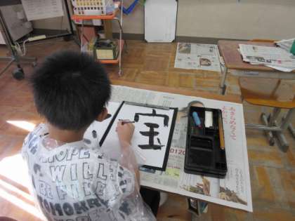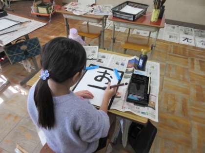 みんなで書初めをしました。書初めにふさわしい文字って、どんな文字があるかを出し合った後、その文字の中から自分の書きたい文字を選んで書きました。小筆で名前を書くのは難しかったのですが、みんな集中して頑張りました。