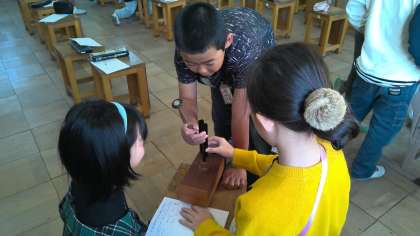 音は耳で聞いて感じますが、理科の学習ということで、今日は「目」と「手」で音を感じてみました。