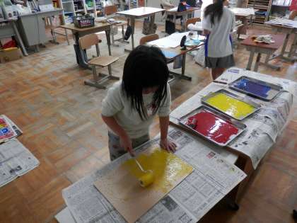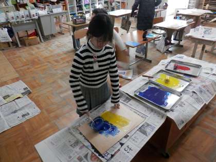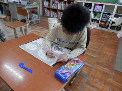 なかよし学級の低学年は、スチレン版画に取り組んでいます。下絵を描いて版に写し、付属のプラスチックペンで溝を作ります。ローラーでインクを付けて和紙に写すと・・・。