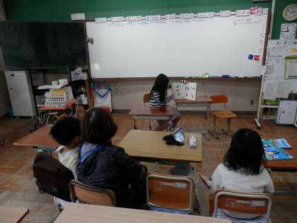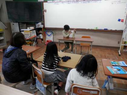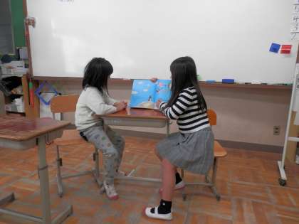 相手の方に本を向けて、見ている人が見やすいように読んでいました。