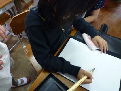 この日は初めての毛筆の学習。準備・筆圧のかけかた・後片付けを学びました。