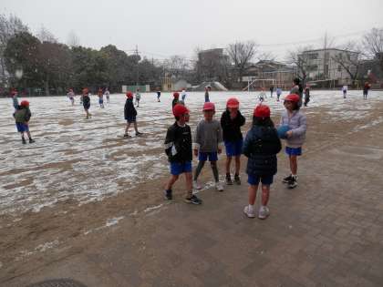 雪がちらつく寒い中でも、がんばって体育をしていました。