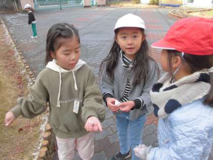 中間休みには、うっすらと積もった雪を集め、小さな雪だるまのようなものを作っている子いました。