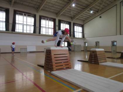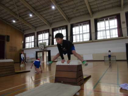 みんな跳び箱が大好きで、早くしたいと心待ちにしていました。7段を軽々と跳ぶ子や、3段に挑戦する子、ジャンプで飛び降りることに挑戦する子など、それぞれのめあてに向かって一生懸命頑張っています。