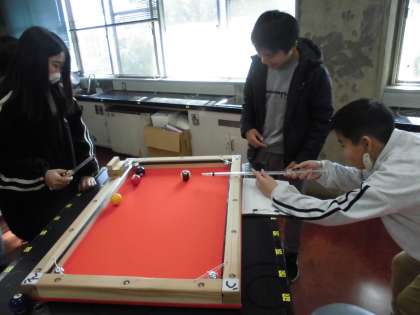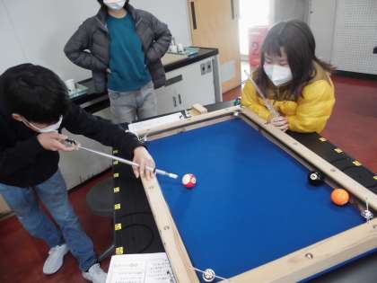そして、最後に再びビリヤードをしました。授業の初めにしたときと違い、当てる角度や力等、学んだことを活かして作戦を立て、取り組みました。