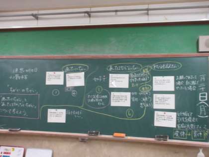 毎月の「思いやりの日」の1月のテーマは「男女平等」についてです。高学年は、男女の「ちがい」にまつわる身近な例について、「あっていい違い。」と「あってはいけない違い。」に分けて話し合いました。