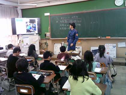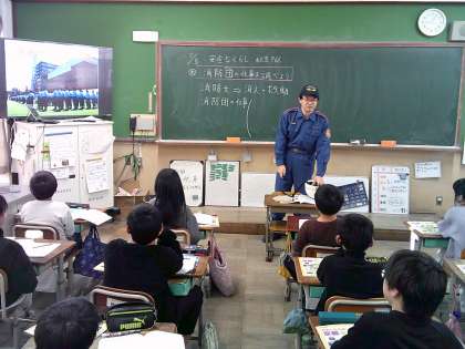 今日は、川岡東小の先生で地域の消防団員に参加している先生に来てもらい、消防団員のお仕事を聞きました。