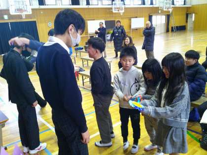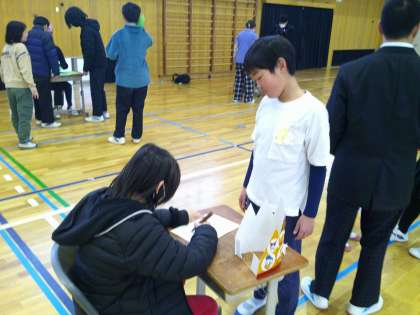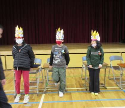 今日は、桂川中学校ブロック4校の小中学校育成学級が集まって、卒業をお祝いする会をしました。卒業生の紹介の後は、在校生が、王冠をかぶった卒業生のサインを集めてまわる「おめでとうラリー」です。在校生は、ちょっと寂しい気持ちもあるけれど、卒業生を憧れの気持ちで見ていました。最後は卒業生にプレゼントを渡して、卒業生からの言葉です。なかよし学級の3人も、とても立派に言葉を言っていました。