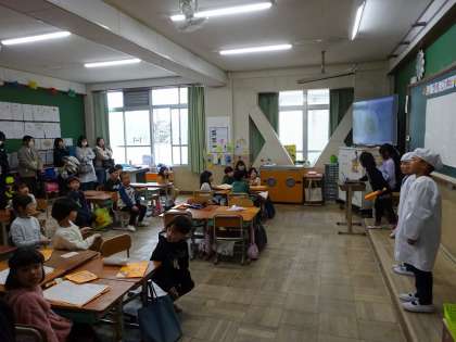 1年生では、「小学校は楽しいところだよ」と来年度入学する児童のために、学校生活を紹介する発表を行いました。給食当番の紹介もあり、とても分かりやすく説明できていました。