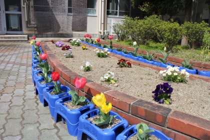 正門の桜が満開です。昨年度に1年生が植えたチューリップも春の陽気を喜んでいるようです。新学期が楽しみです。