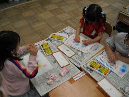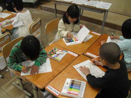 なかよしタイムでは、友達と机を合わせて活動しています。「何してるの?」「こんなのかいたよ。」お話しながら、なかよくなりました。