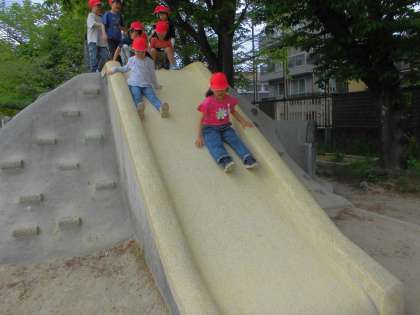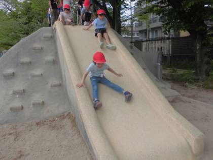 最近おさんぽで、1年生が興味津々だった築山の滑り台に行きました。ずっと楽しみにしていた滑り台に大喜び!ほかにも学校で楽しいところが見つけましょうね。