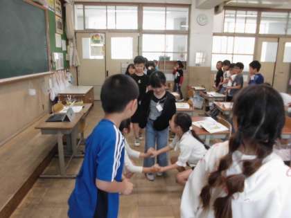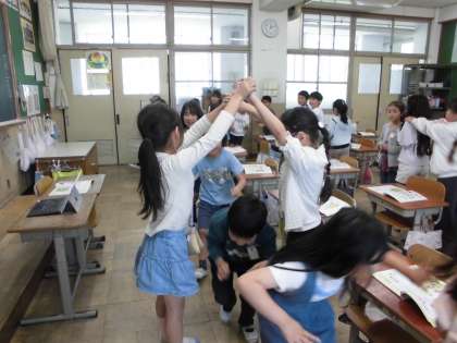 「小犬のビンゴ」の、BINGOの一部分を手拍子したり、「ロンドンばし」では、全員で列になって拍にのって歩き、曲に合わせて橋が落ちてつかまる遊びをしたりして楽しみました。