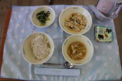 今年度初めての和献立で「筍のあんかけご飯」「大根葉とじゃこの炒め物」「春野菜のみそ汁」でした。