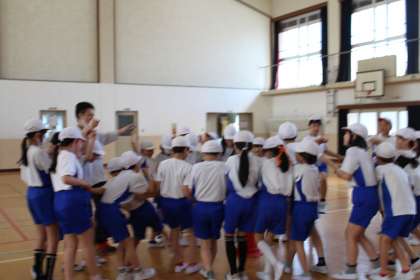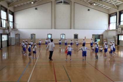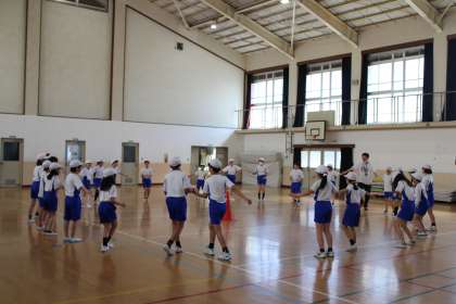 来月に山の家に行く5年生が体育館でフォークダンスをしていました。