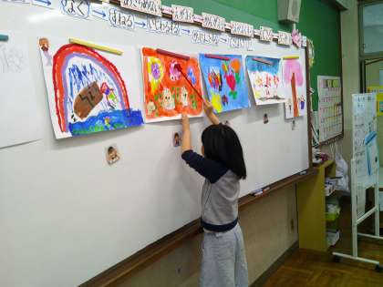 絵の具やクレパスなどそれぞれ好きなもので塗り、春らしい色鮮やかな絵になりました。