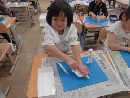 粘土の学習の前に粘土をやわらかくする粘土体操もしました。カチカチの粘土をちぎったり、まるめたり、のばしてみたり。作品を作る前からとっても楽しそうな1年生でした。
