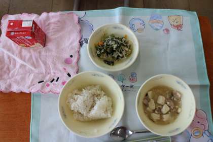 今日は「豚肉と豆腐のくず煮」「ほうれん草と切干し大根のごま煮」でした。