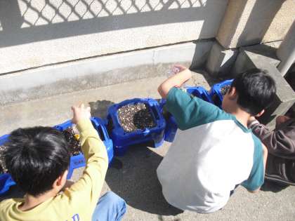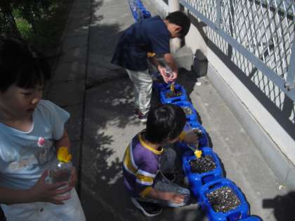 今朝は先週植えたアサガオの水やりをしました。早くも小さい芽が出ている植木鉢も。早速の変化に子どもたちも大喜びです。明日からも毎朝コツコツ水やりを続けていきましょう。