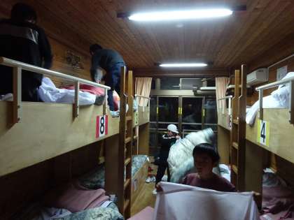 そして寝るための準備や明日に備えて荷物整理などをしていました。シーツを敷くのに苦戦していましたが、