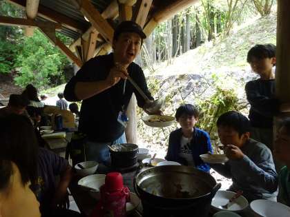 担任の先生が各班のすき焼き風煮を食べに来てくれました。