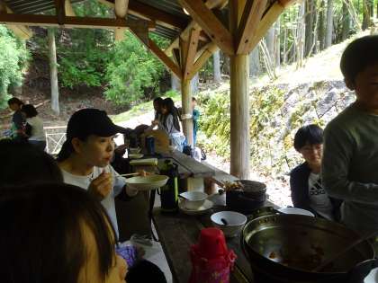 山の家での最後の食事です。ご飯もきれいに炊けていましたね。すき焼き風煮は具沢山でおいしかったです。作り方は今回学んだので、今度はご家庭でも作ってみてもいいかもしれませんね。