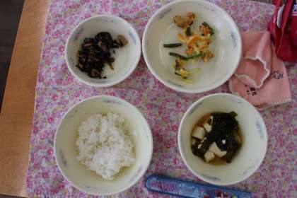 今日は「新じゃがいものかきあげ」「たけのことひじきの煮つけ」「新玉ねぎのみそ汁」でした。