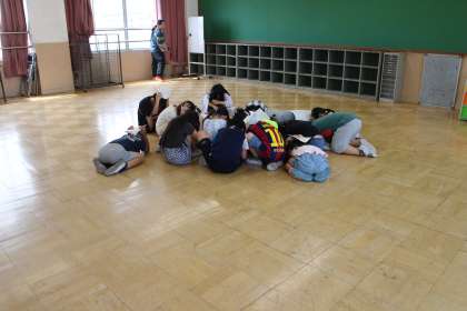 学年集会をしていた2年生は、教室への移動中にサイレンが鳴りましたが、多目的教室の真ん中に静かに集まって頭を守っていました。
