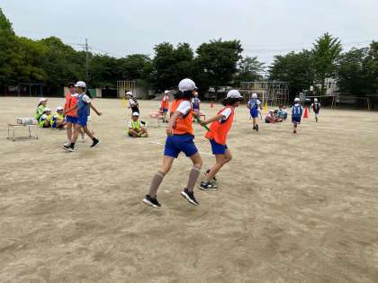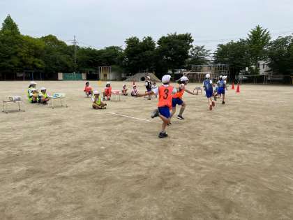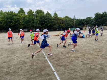 今日から始まったリレーの学習でもバトンパスに重点をおいて練習しています。日本チームの「アンダーハンドパス」とは違い,小学校の体育科では、「オーバーハンドパス」をします。学習カードに書かれているポイントや担任,友だちの助言をもとにチームで協力して記録を伸ばしていきます。