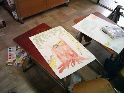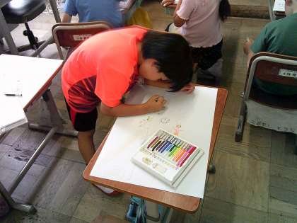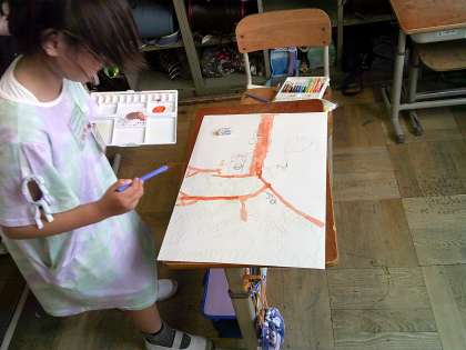 図工の学習の様子です。前回、スケッチをしたお気に入りの木を画用紙に描きました。