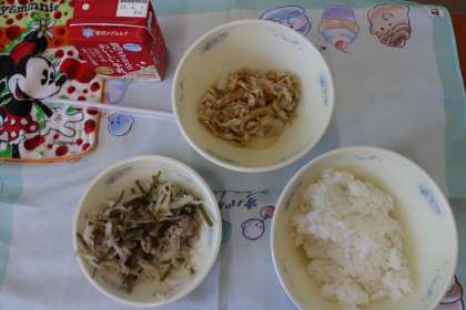 今日は沖縄料理の「油揚げのチャンプル」「クーブイリチー」でした。