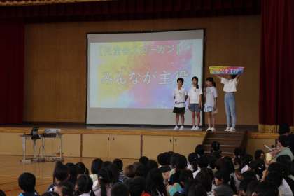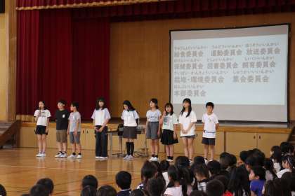今日は、児童会目標の発表や、各委員会の委員長から今年度の取り組みについて発表がありました。
